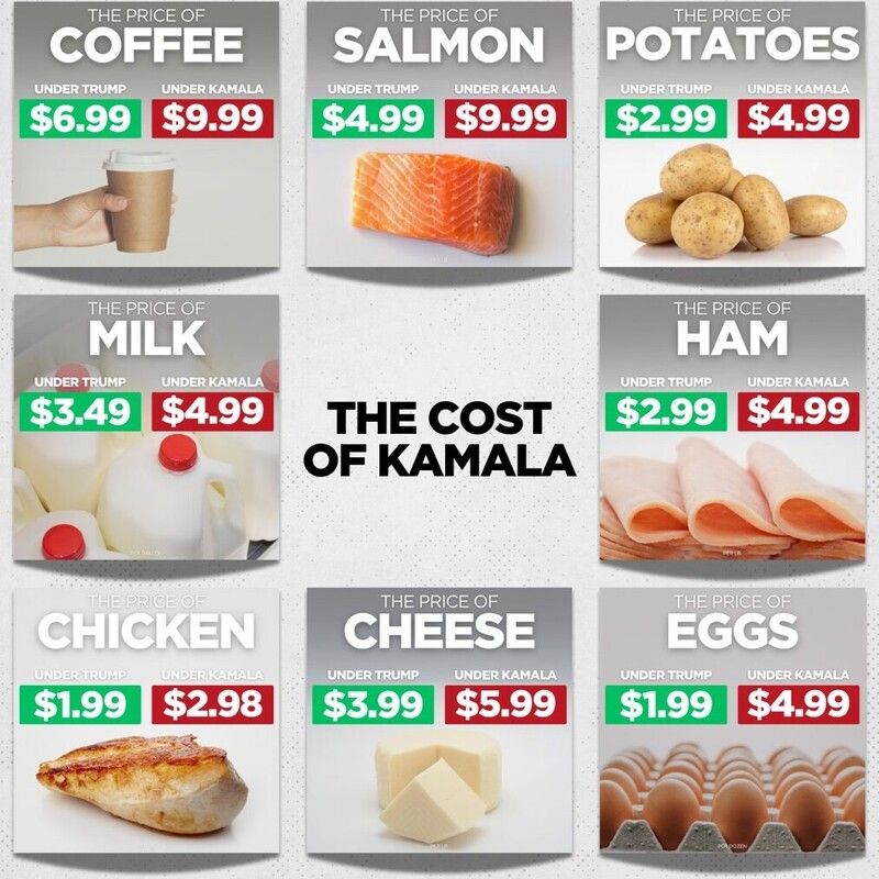 To get the pic, check out 8 common grocery item prices under Trump like a dozen eggs was $1.99 under Trump, under Harris/Biden, $4.99. And these are the exact foods setaG wants to laboratory-tize or GMO or make fake. Fake foods not good for our cells, we’ll lose stamina, be weakly then sickly …. but don’t worry🤥, beeg faarma has the drugs.