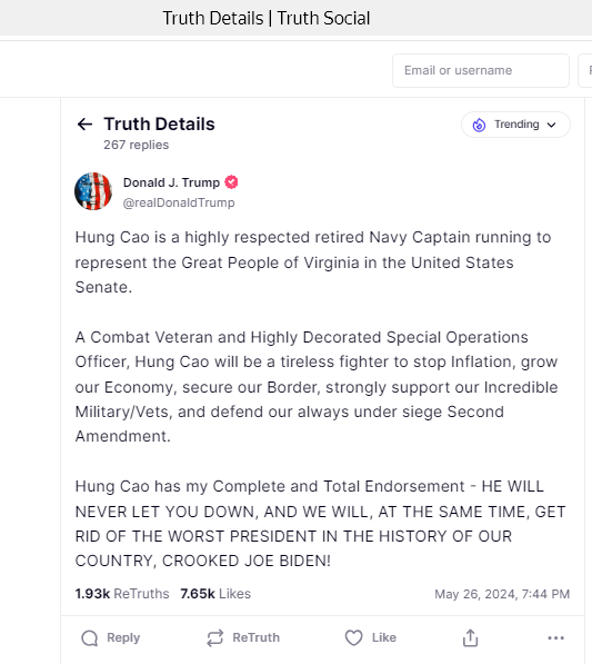 “Hung Cao has my Complete and Total Endorsement” – Pres. Donald Trump. Engineer, Physicist and retired U.S. Navy Captain Hung Cao for U.S. Senate representing Virginia.