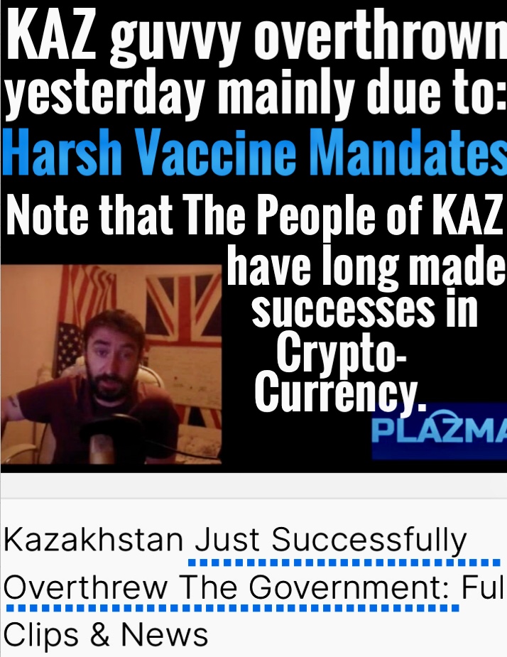 The big lie prelude for Globalism. KAZ citizens themselves are saying it’s the COVID mandates, KAZ pple can’t withdraw their money from banks unless they present a vax passport, force to take the toxic boosters, businesses closed, mandates. That’s why all the vaccination centers were burned down or vandalized, banks were rioted and robbed. Even The People my friends are better news reporters. And why Putin had to send troops to go against The People? Like what the first-hand info source said, “ It’s about the vaccinations … People can’t take their money out without a vaccination passport, with that QR codes and all that … This is the start of something beautiful, hopefully it spreads, hopefully it spreads.”