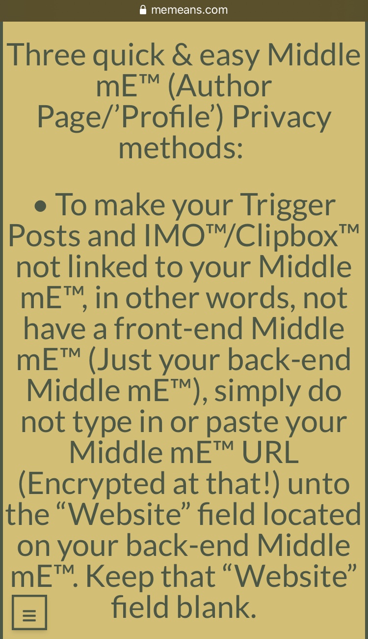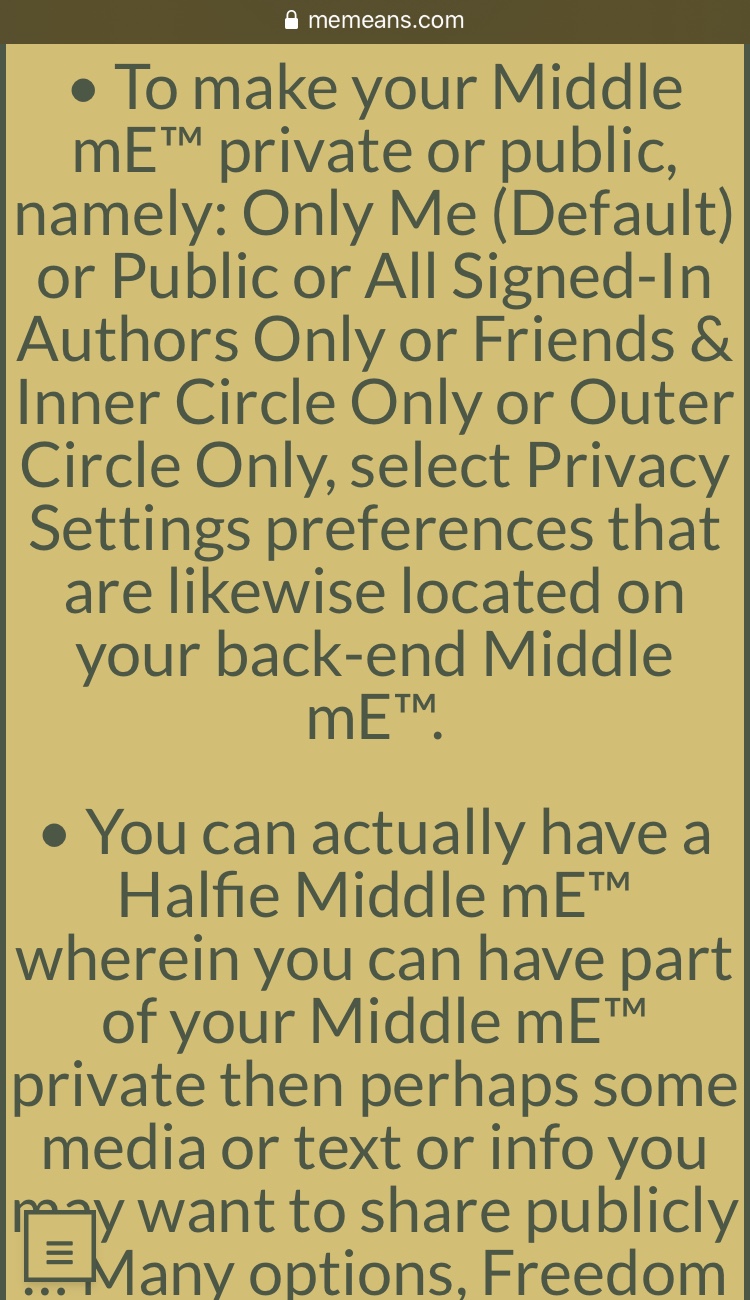BTW, some Authors chose the other 2 Middle mE Privacy themes, some chose not to have a Middle mE Front-End at all and some similar, Triggers and IMOs linked to their Middle mE but still make it Private. You know that anyone can have a ‘Halfie Middle mE‘ – Just jump to the bottom of this info page (Screenshots below too): https://memeans.com/sign-up/